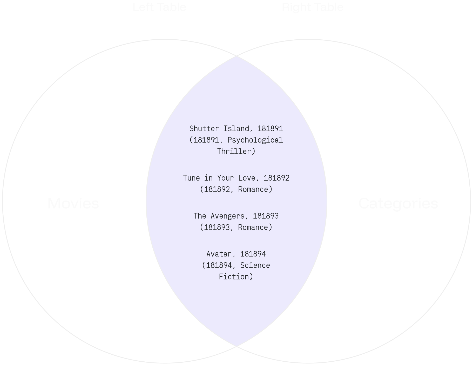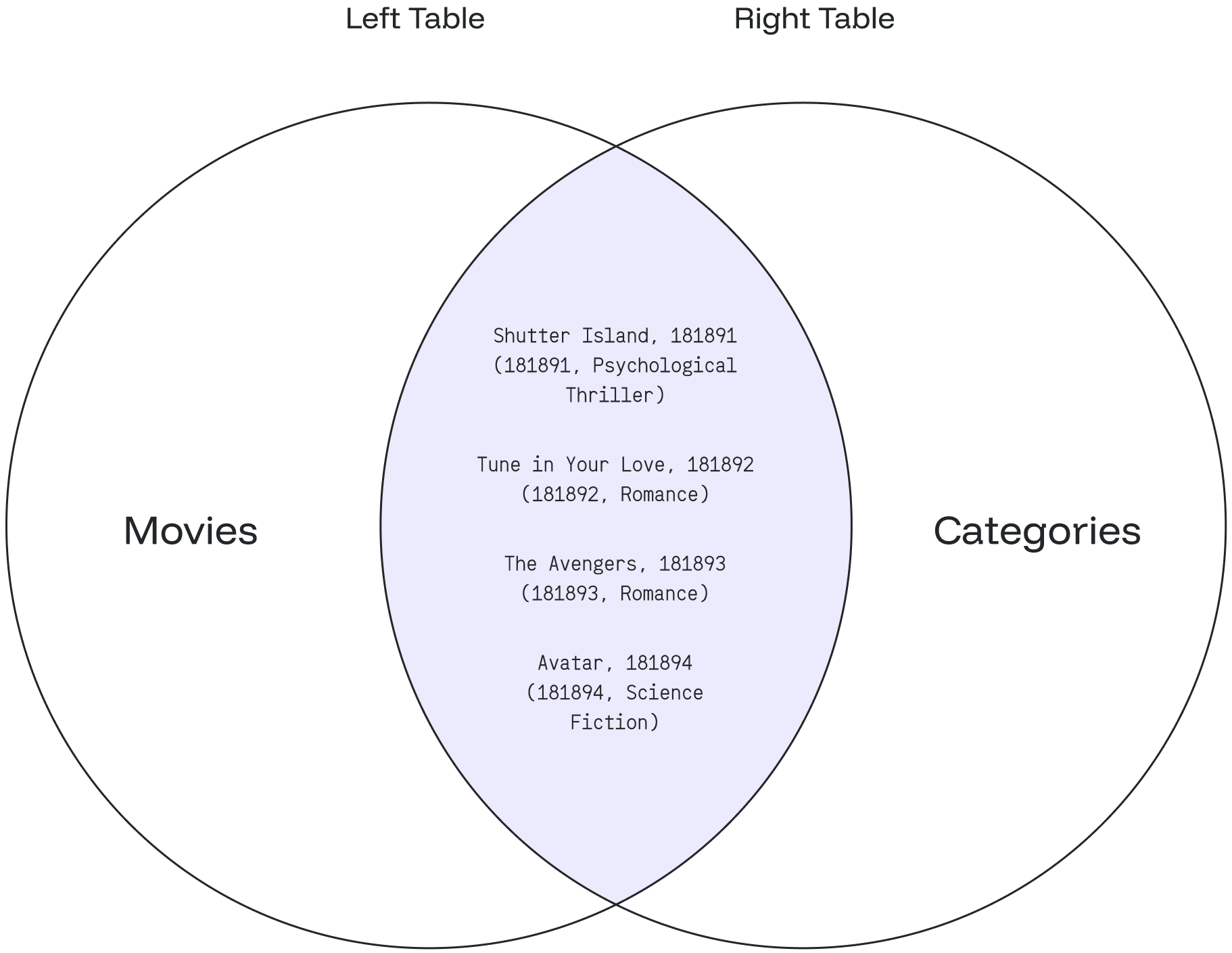If the values are equal, it will create a new row that contains columns from both tables (category_name) and adds the new row (movie_name) to the result set.